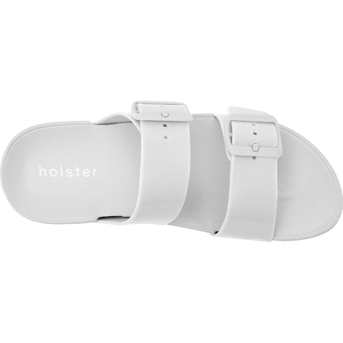 Sandália com duas tiras de PVC reguláveis com fivelas.